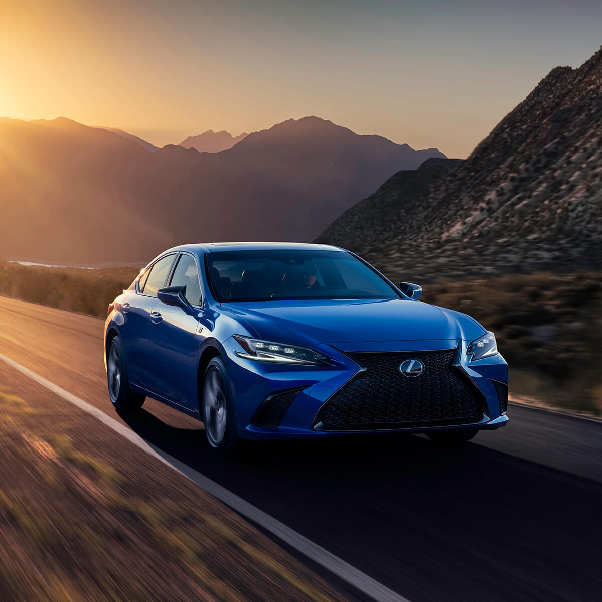 Blue Lexus ES is being driven on the road with a mountainous backdrop.