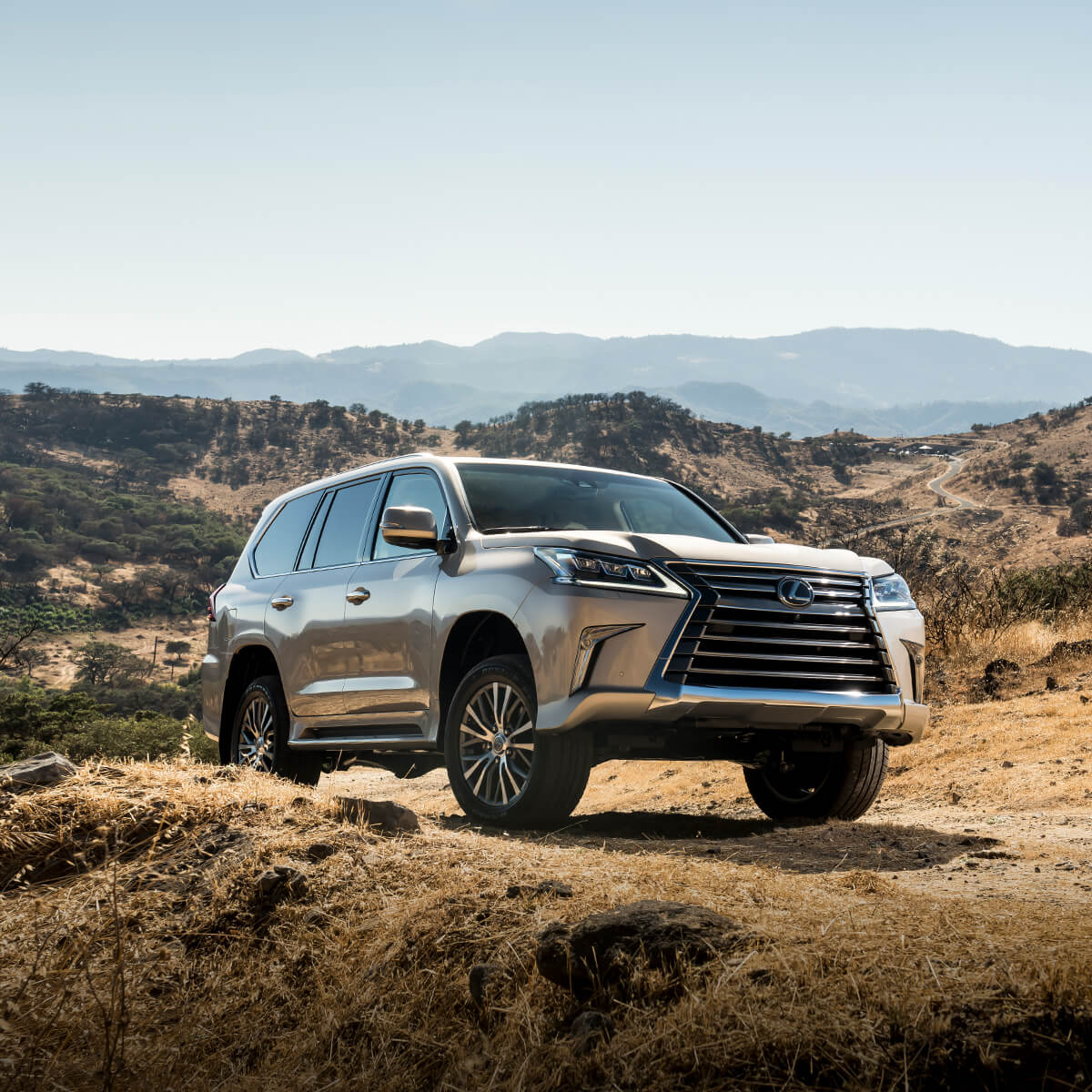 Silver Lexus LX being driven in mountainous terrain.