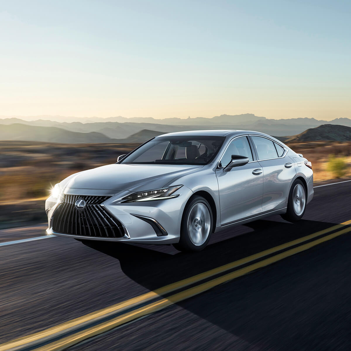 Silver Lexus ES is being driven on the road with a mountainous backdrop.