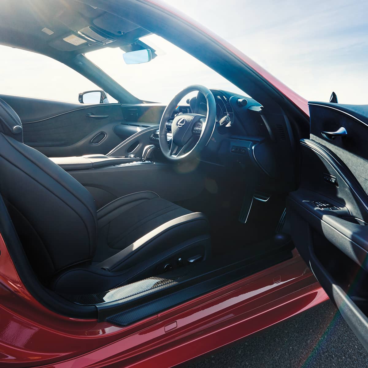 Close up of the driver’s seat of a red Lexus LC. Book a test drive to experience the pleasure of driving a Lexus.